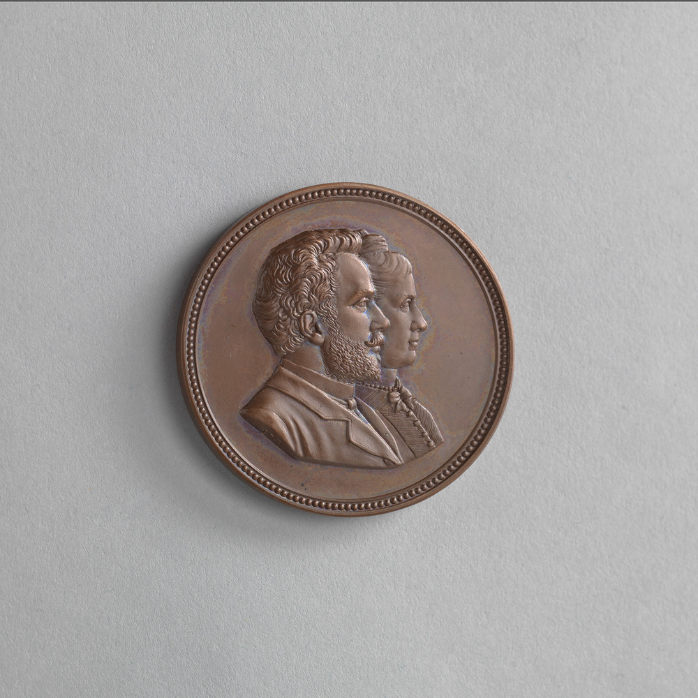 Deze bronzen huwelijkspenning is vervaardigd ter gelegenheid van het huwelijk van Jacobus Rudolph Hendrik Neervoort van de Poll en Marthe Jeanne Elsine Geertruijda Philippine Zubli. Van de Poll en Zubli stapten op 20 mei 1887 te Amsterdam in het huwelijksbootje. Op de voorzijde van de penning zijn de echtgenoten en profil naast elkaar afgebeeld. De keerzijde van de penning toont een krans van rozen, met in het midden de tekst: ‘Jacobus Rudolph Hendrik Neervoort van de Poll en Marthe Jeanne Elsine Geertruijda Philippine Zubli / gehuwd te Amsterdam / 20 mei / 1887’. ( Sarah Remmerts de Vries)