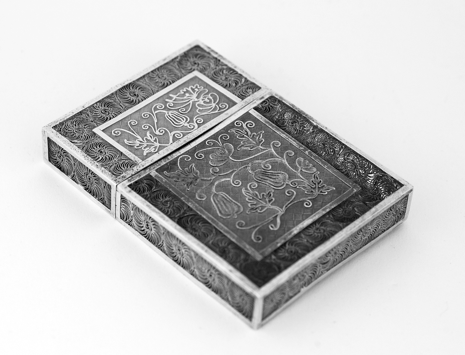 Plat rechthoekig filigrain doosje met schuifdeksel; het doosje is opgebouwd uit platte strippen met daartussen filigrain rozetten en op de brede voor- en achterzijde vormen zij een kader waarin een vlak van filigrain vlechtwerk waarop florale motieven zijn aangebracht; het rechthoekige kader loopt door in het deksel. Op de bovenzijde is een ellipsvormig plaatje voor een signature.