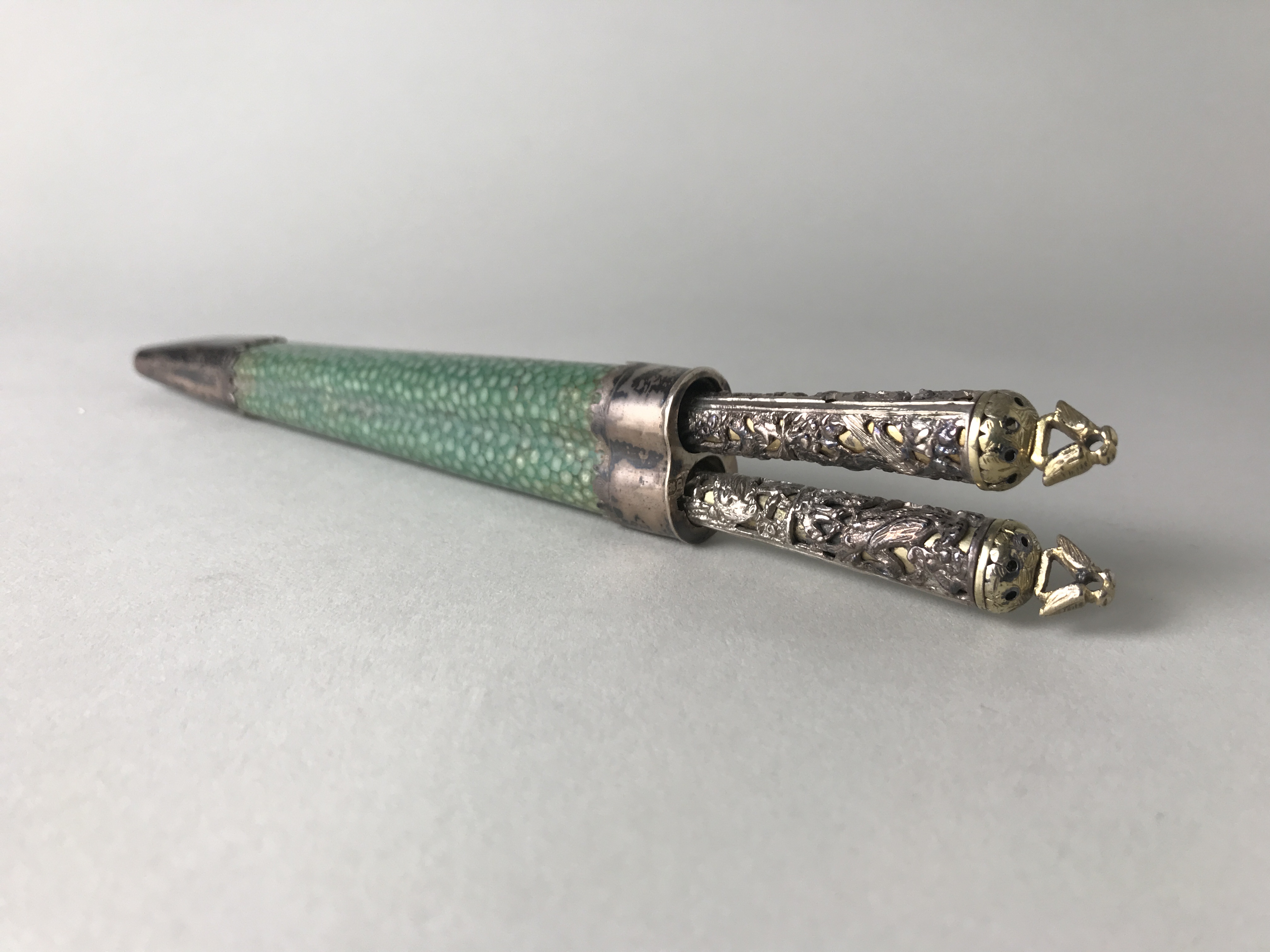 Persoonlijk bestek, bestaande uit vork met drie tanden en mes met stalen lemmet. Beide met gegoten, taps toelopend heft met verguld zilveren kern en opengewerkte zilveren wand met vogels tussen bloem- en bladranken. Afgerond, verguld zilveren uiteinde met knop in de vorm van twee tortelduiven. Mes en vork geborgen in een schede van groen gebeitst, gepolijst roggenleer met rand- en puntmontuur van zilver. Bestek, bestaande uit vork en mes met stalen lemmet. Beide met taps toelopend heft met opengewerkte zilveren wand met vogels en bloem- en bladranken rond een verguld zilveren staaf. Afgeronde steelkop met knopje in de vorm van twee verguld zilveren tortelduiven. Vork en mes geborgen in schede van groen gekleurd, gepolijst roggenleer met rand- en puntmontuur van zilver.