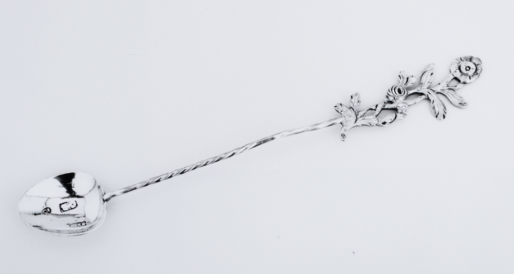Lepel met stomp ovale bak, met een naald verbonden aan getordeerde steel. Steelbeëindiging met gegoten, opengewerkt ornament van bloemtakken.