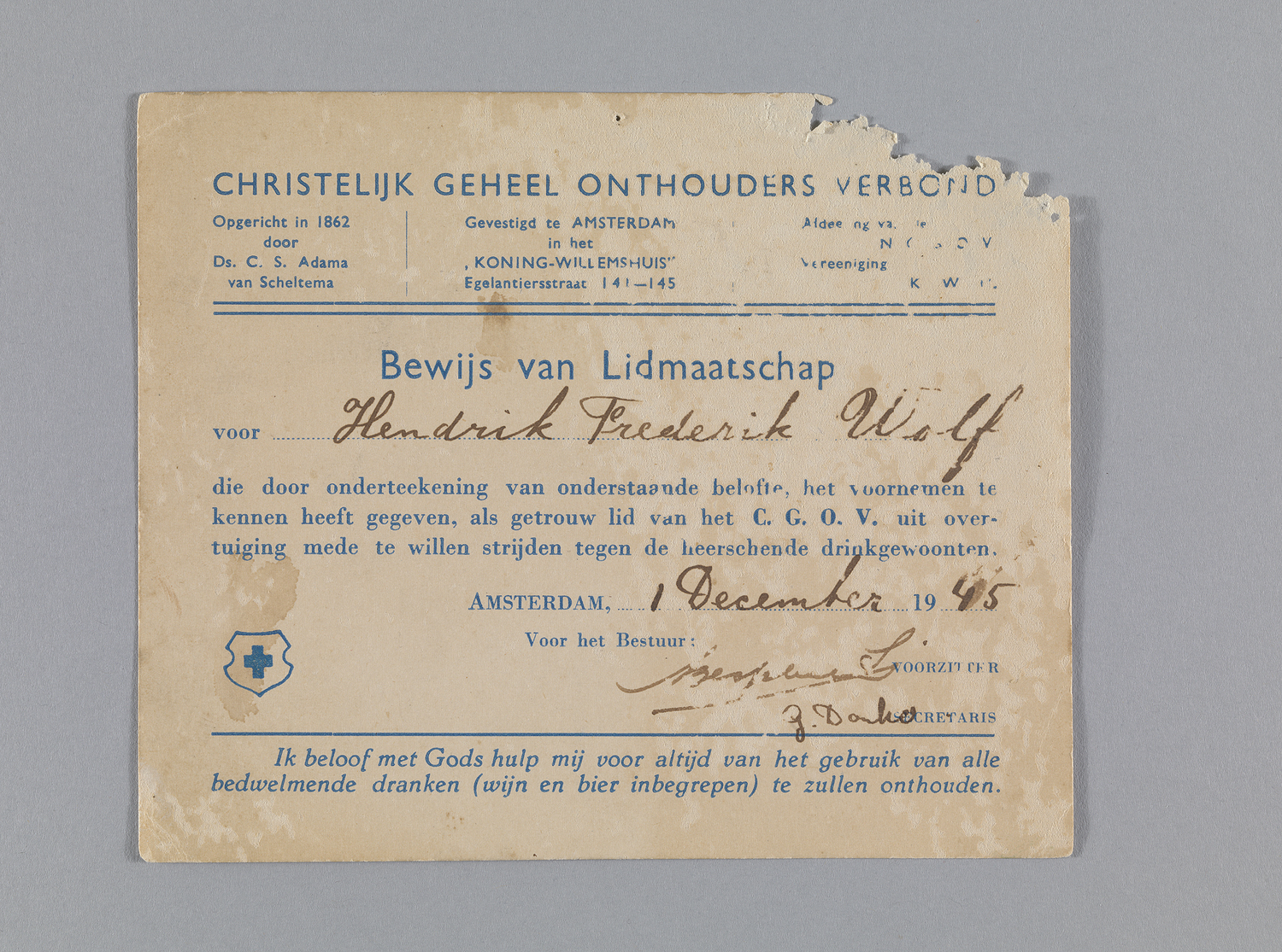 Lidmaatschapskaart uit 1945 van het Christelijk Geheelonthouders Verbond, dat was gevestigd in het Koning Willemshuis aan de Egelantierrstraat. Oprichter in 1862 én allereerste pleitbezorger voor geheelonthouding in ons land was de charismatische dominee Carel Steven Adama van Scheltema (1815-1897). Van hem heeft het Amsterdam Museum ook een portret in de collectie.