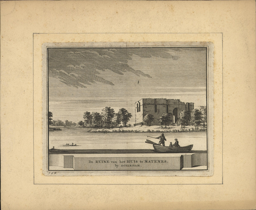 opschrift midden onder in afbeelding: De RUINE van het HUIS te MATENS. / by SCHIEDAM. - aangetroffen 1985-02