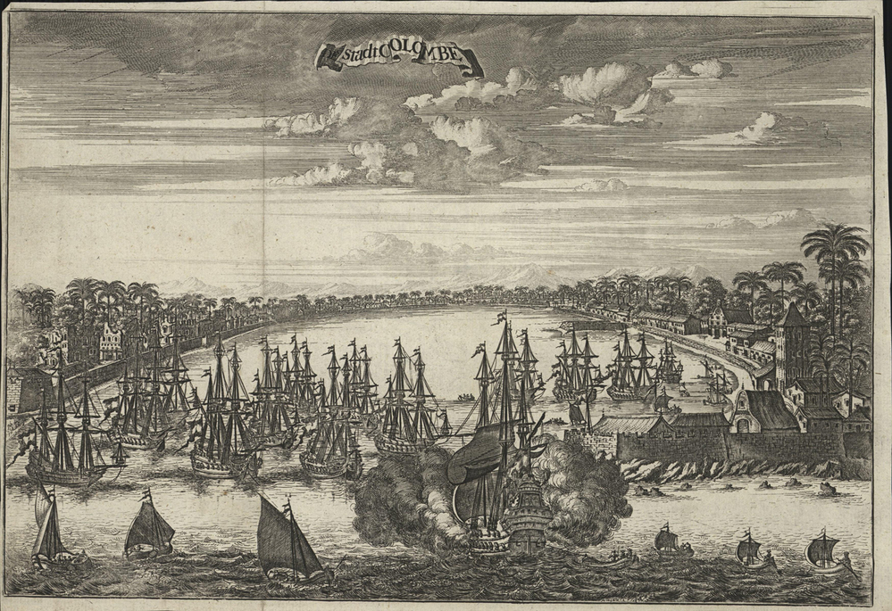 Gezicht op de stad Colombo, met op de voorgrond de haven met talrijke, merendeels voor anker liggende, Oost-Indiëvaarders
