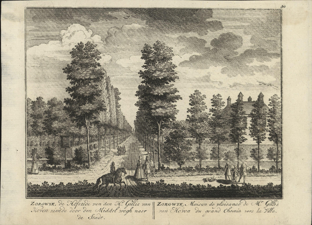 opschrift links onder in de marge: ZORGWYK, de Hofstede van den Hr. Gillis van/ Hoven ziende door den Middel wegh naer/ de Stadt.