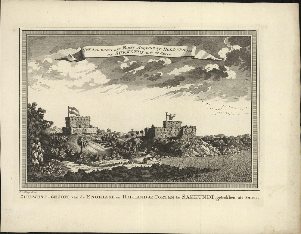 opschrift midden onder in marge: ZUIDWEST-GEZIGT van de ENGELSSE en HOLLANDSE FORTEN te SAKKUNDI, getrokken uit SMITH.
