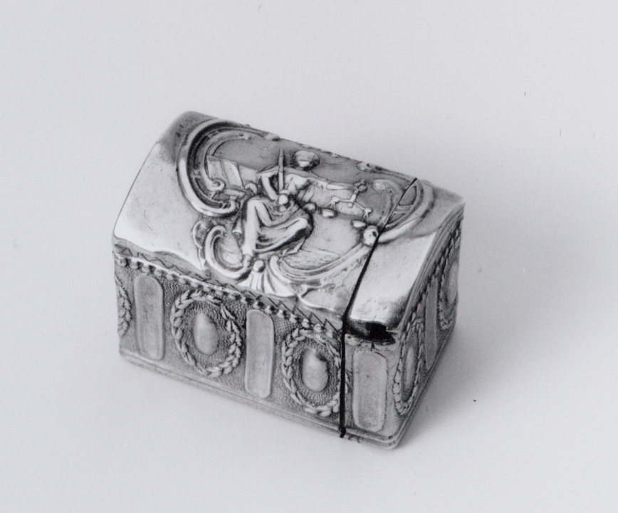 Koffervormige doos met zijwaarts scharnierend deksel. Reliëfdecors op een geruwde ondergrond. Op deksel een voorstelling van Justitia, personificatie van de Rechtvaardigheid. Wanden met medaillons en ovale lauwerkransen, alternerend met verticale stijlen. Op binnenzijde deksel en binnenrand doos is: XIII/ gegrift. Op een van de korte wanden is de letter: D/ geponst, alsmede een onduidelijke letter.
