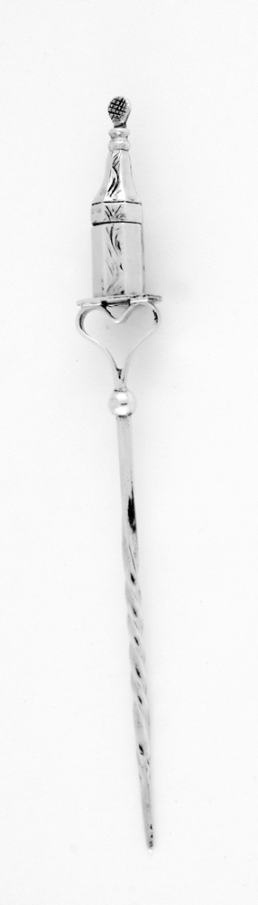 Wroeter met een vierkante steel en getorst middenstuk, bovenzijde een bol met een open hartvorm waarop een rond glad schijfje met een achthoekige fles, deze heeft een deelbare bovenstuk waarin een kelkvormig glas. De fles is op vier zijden gegraveerd met bladmotieven.- Trefwoorden