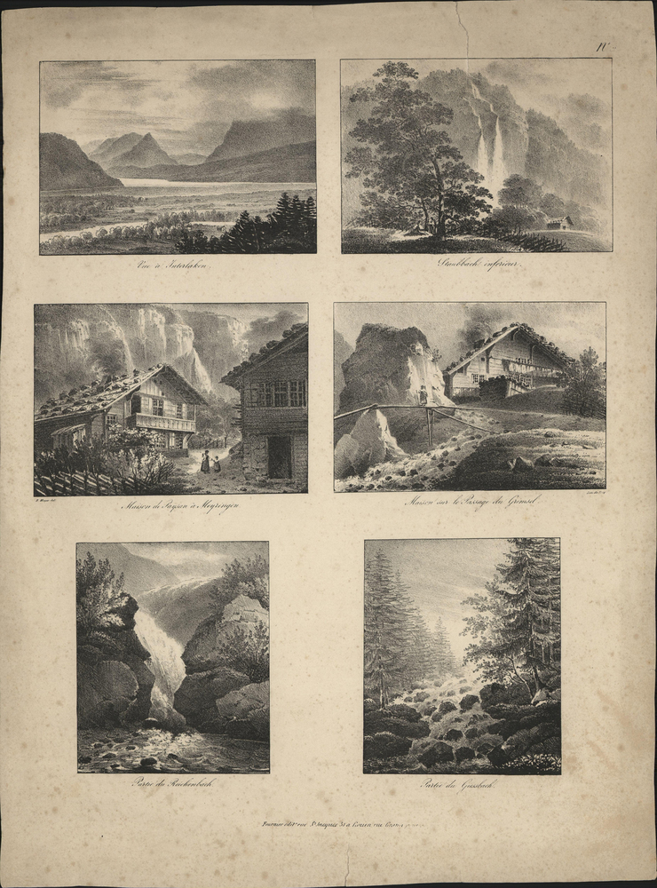 - opschrift marge onder afbeelding: Vue à Interlaken / Staublach inferieur / Maison de Paysan à Meyringen / Maison sur le Passage du Grimsel / Partie du Reichenbach / Partie du Giessbach