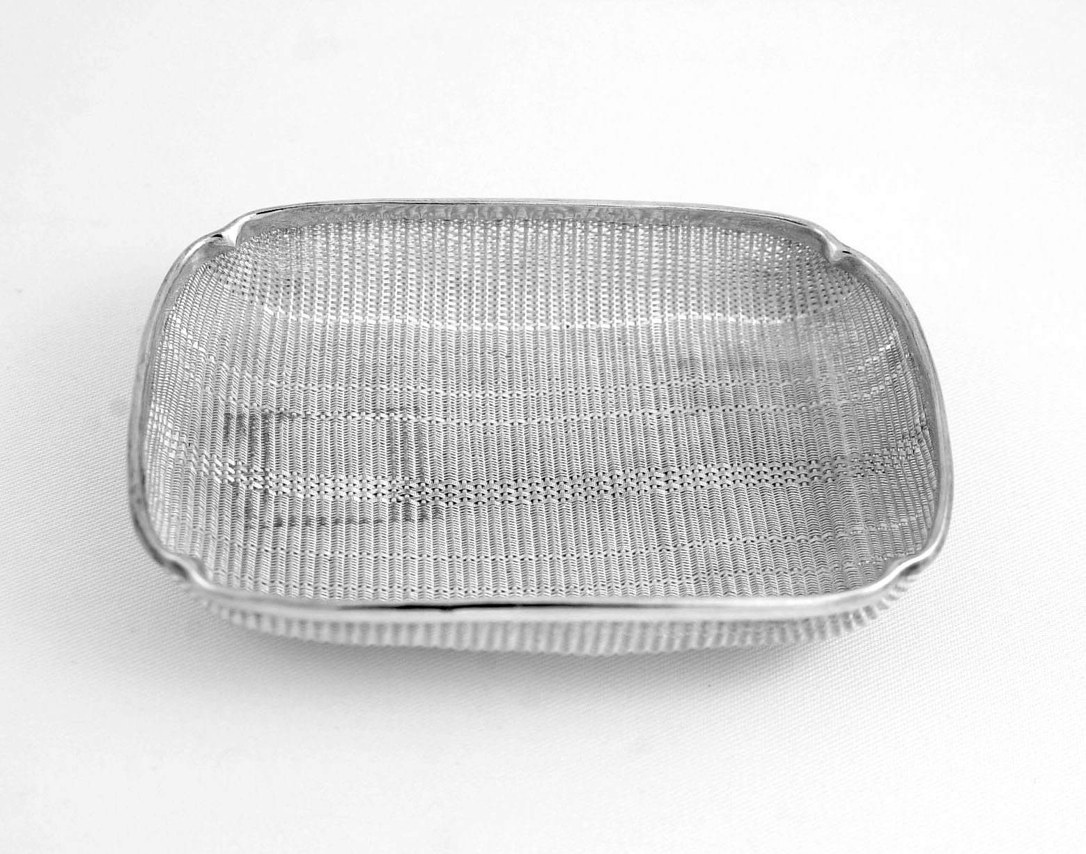 Laag, rechthoekig mandje met ronde inspringende hoeken, gevlochten van zilverdraad, gezet in zilveren montuur.- Trefwoorden