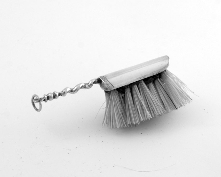 Halfronde rug met afgeronde voorzijde, getorste steel met oog en ophangring, langs steelaanzet op de rug een gegraveerde randversiering.- Trefwoorden