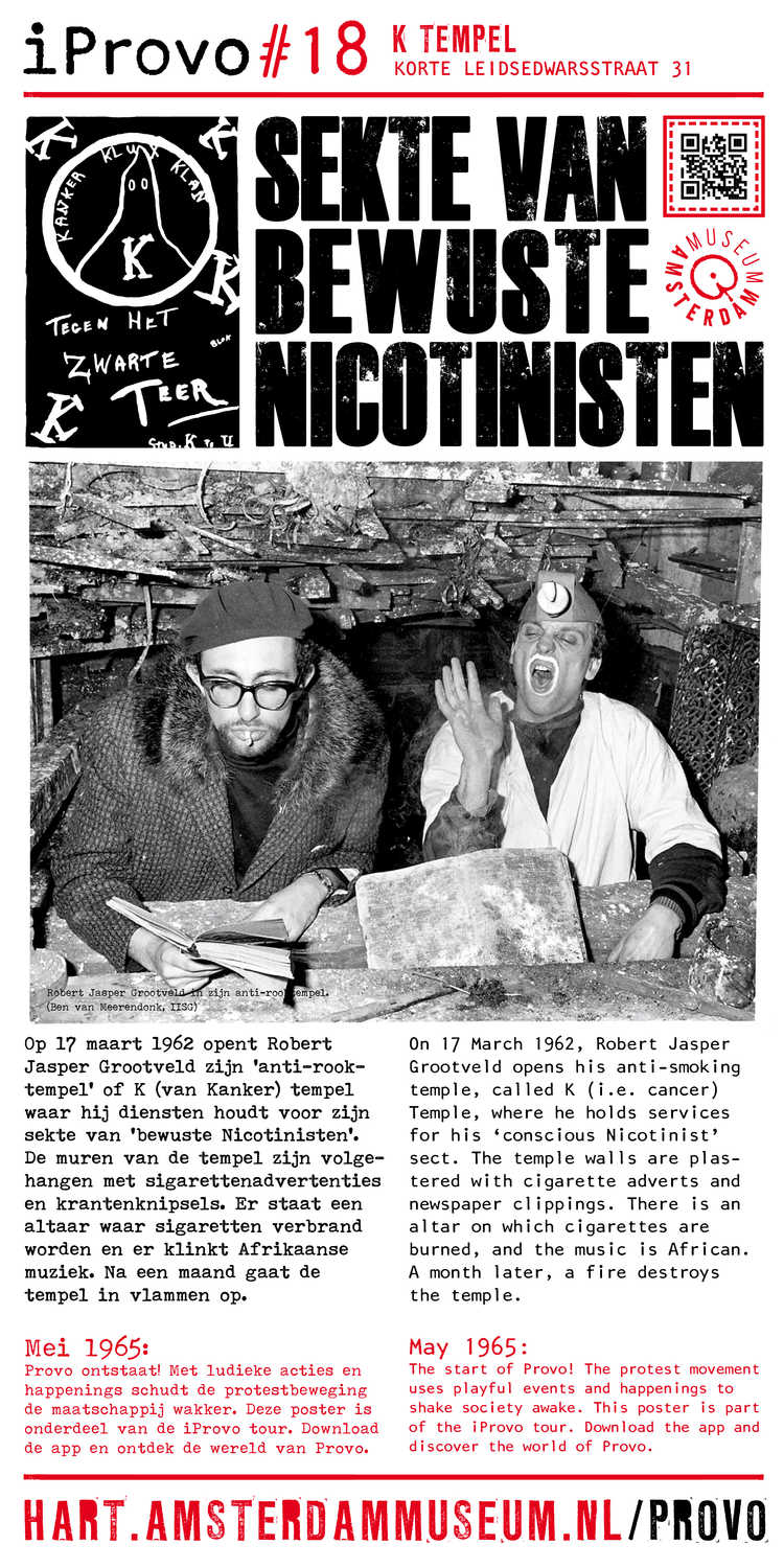 iProvo #18: Sekte van Bewuste Nicotinisten. Op 17 maart 1962 opent Robert Jasper Grootveld zijn ‘anti-rooktempel’ of K (van Kanker) tempel waar hij diensten houdt voor zijn sekte van ‘bewuste Nicotinisten’. De muren van de tempel zijn volgehangen met sigarettenadvertenties en krantenknipsels. Er staat een altaar waar sigaretten verbrand worden en er klinkt Afrikaanse muziek. Na een maand gaat de tempel in vlammen op. ( Annemarie de Wildt)