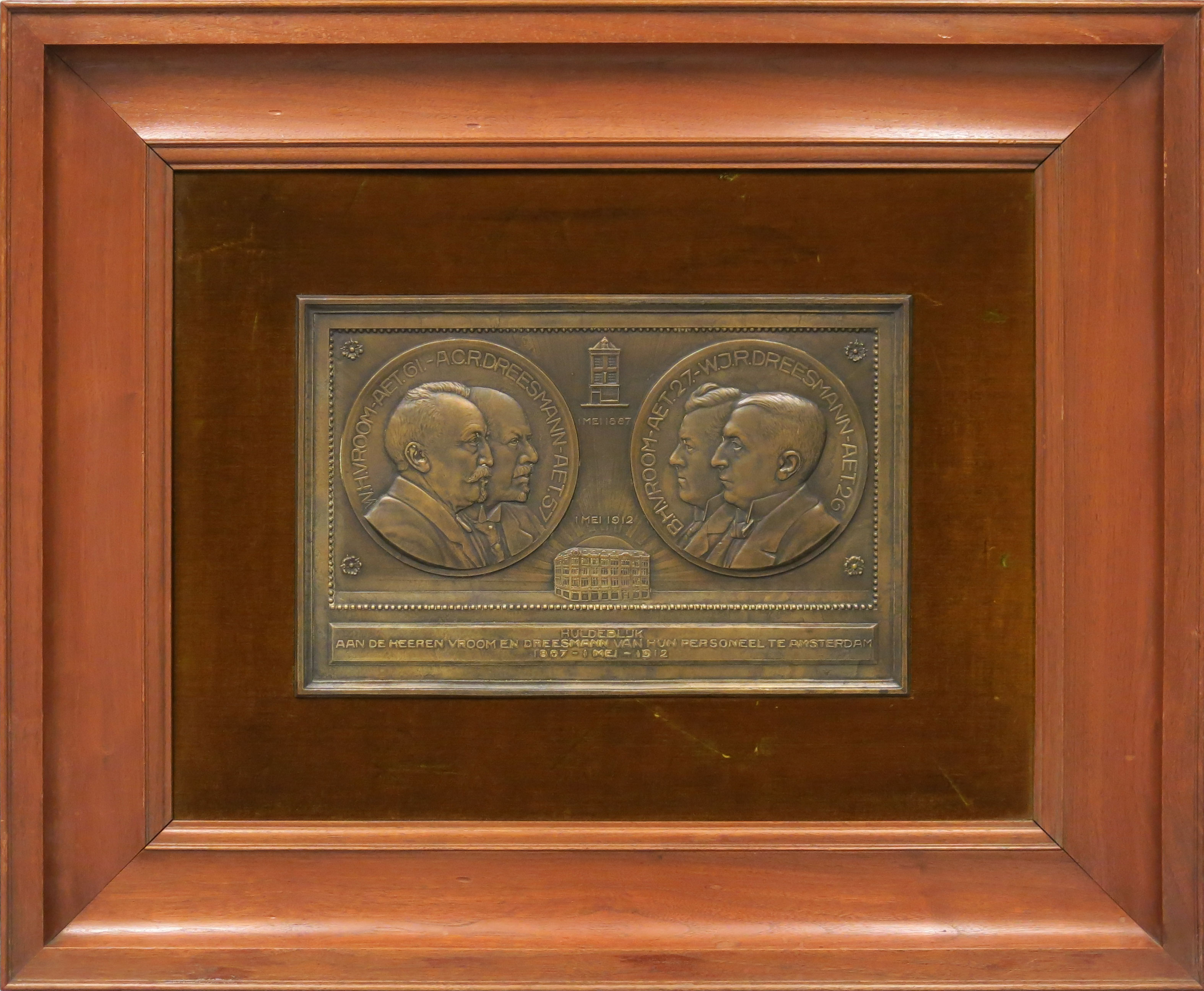 Bronzen plaquette van de stichters W.H. Vroom en A.C.R. Dreesmann en hun opvolgers B.H. Vroom en W. Dreesmann, aangeboden door het personeel van V&D Amsterdam ter gelegenheid van het 25-jarig bestaan op 1 mei 1912, 1912