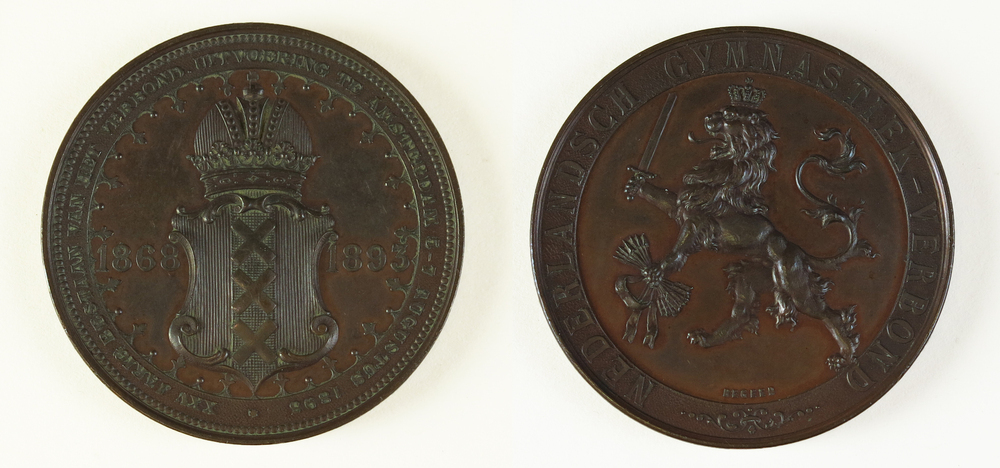Deze bronzen penning is geslagen ter gelegenheid van het 25-jarig bestaan van het Nederlandsch Gymnastiek-Verbond (N.G.V.) in 1893. Het Verbond is op 15 maart 1868 opgericht met als doel de beoefening van gymnastiek te bevorderen. Sinds 1902 trad koningin Wilhelmina als beschermvrouwe van het N.G.V. op. Zij gaf het Verbond bij het 50-jarig bestaan in 1919 het predikaat ‘Koninklijk’ mee. Ter gelegenheid van het 25-jarig bestaan werden van 5 tot 7 augustus 1893 uitvoeringen gegeven in Amsterdam. De rondlopende tekst op de voorzijde van de penning herinnert aan deze gebeurtenis. In het midden van de tekst is het gekroonde stadswapen van Amsterdam te zien. De achterzijde toont de naam van het Verbond met een afbeelding van een leeuw met kroon op de kop en in zijn poten een zwaard en zeven pijlen. ( Sarah Remmerts de Vries)