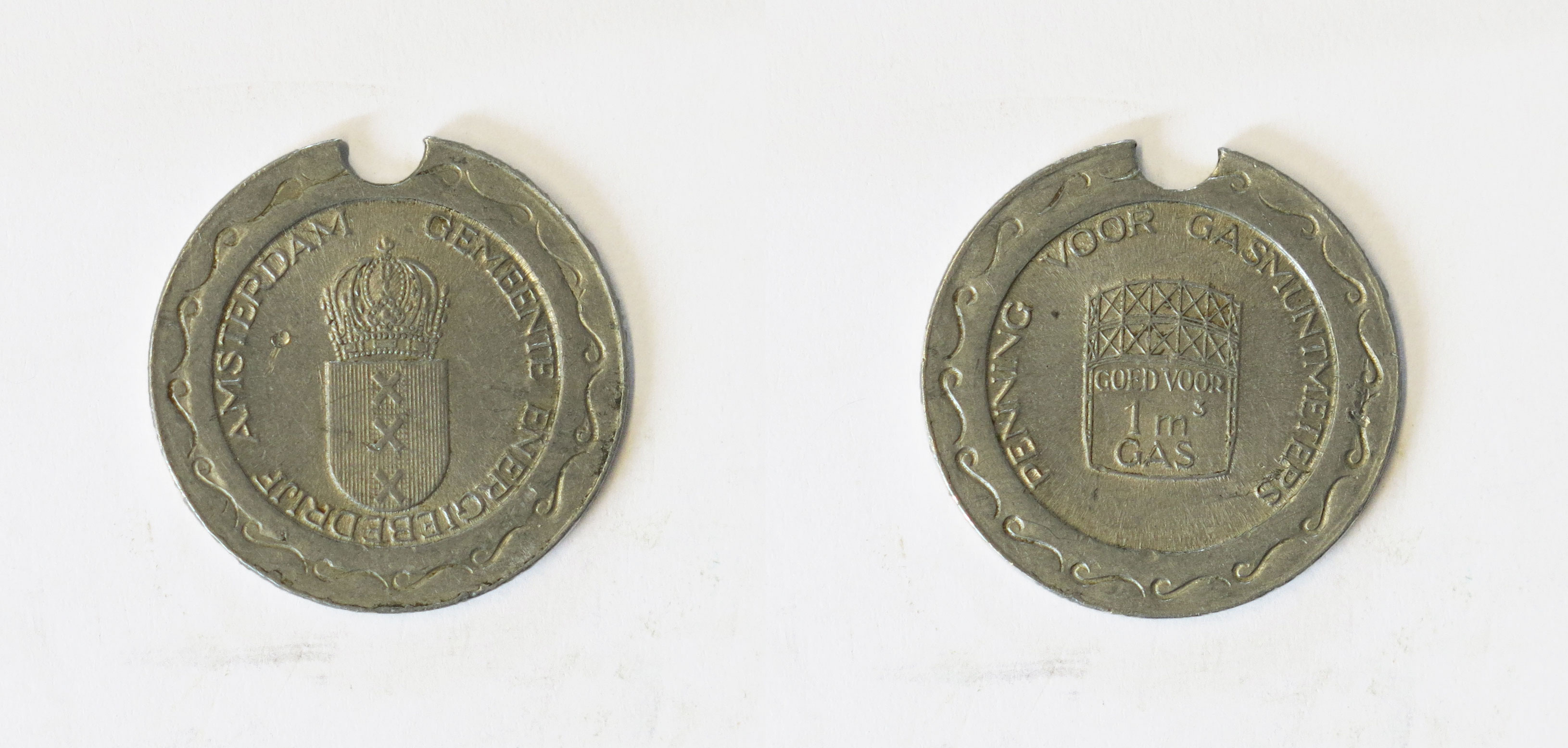 Een gasmunt was een penning waarmee tot de jaren vijftig van de twintigste eeuw in veel gemeenten betaald kon worden voor het gasverbruik. Doel hiervan was om te voorkomen dat mensen een te grote betalingsachterstand opliepen. Dit muntje was uitgegeven door het Gemeente Energiebedrijf (GEB) Amsterdam en was goed voor 1 kubieke meter gas ( Judith van Gent)