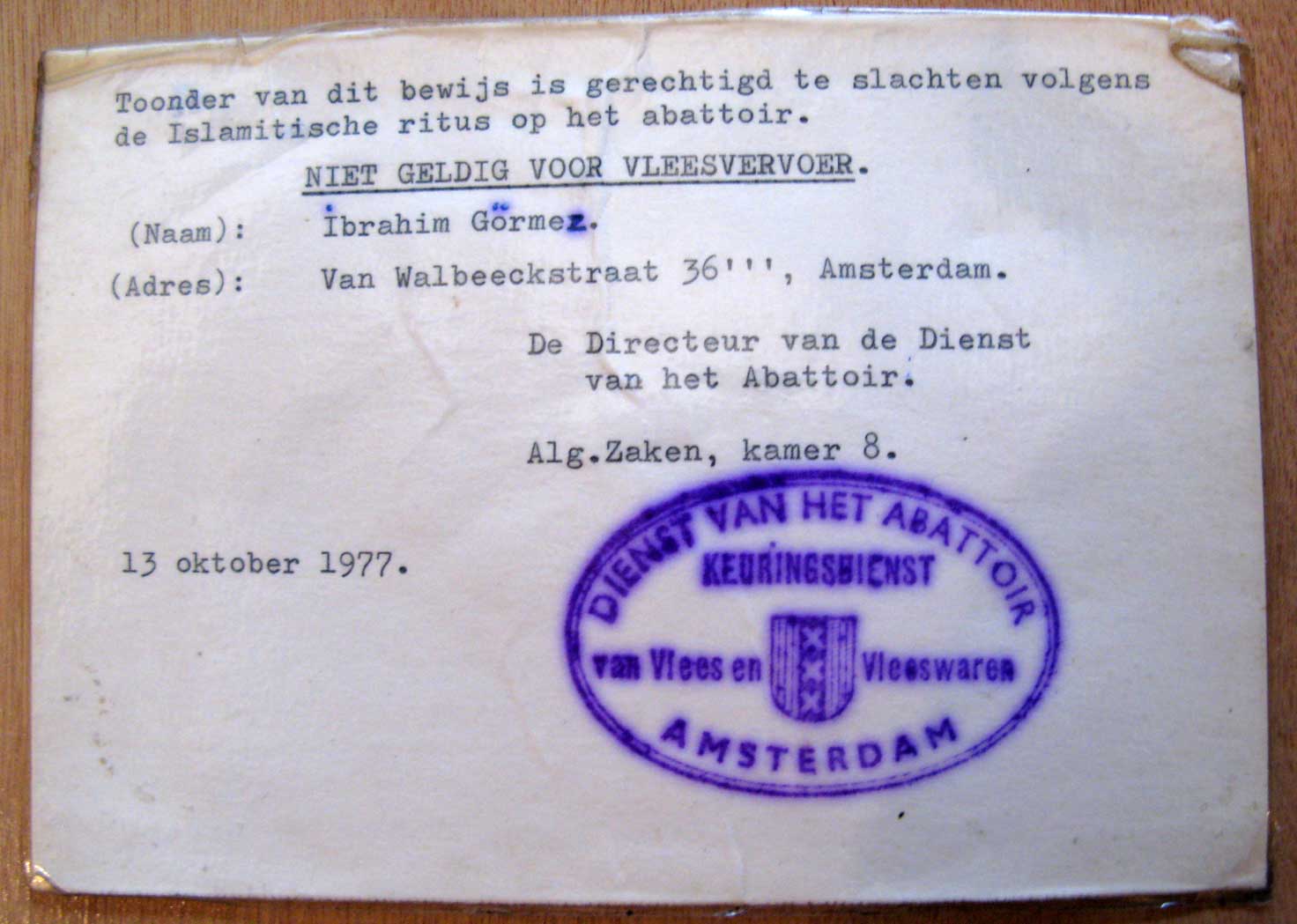 Deze vergunning voor ritueel slachten is in de museumcollectie opgenomen in het kader van de tentoonstelling '100 Jaar Schiphol. Klaar voor vertrek', die van 16 september 2016 tot en met 7 mei 2017 te zien was in het Amsterdam Museum. Op Schiphol werken zo’n 65.000 mensen. Al die mensen hebben een speciaal pasje. Ibrahim Görmez was één van de eerste Turkse gastarbeiders in Amsterdam. Hij kwam in 1964 aan op Schiphol en ging er in 1970 op de bagageafdeling werken. Het was een zwaar beroep, want alles moest nog met de hand worden getild. ( Sarah en Hasselt Remmerts de Vries, Laura van)