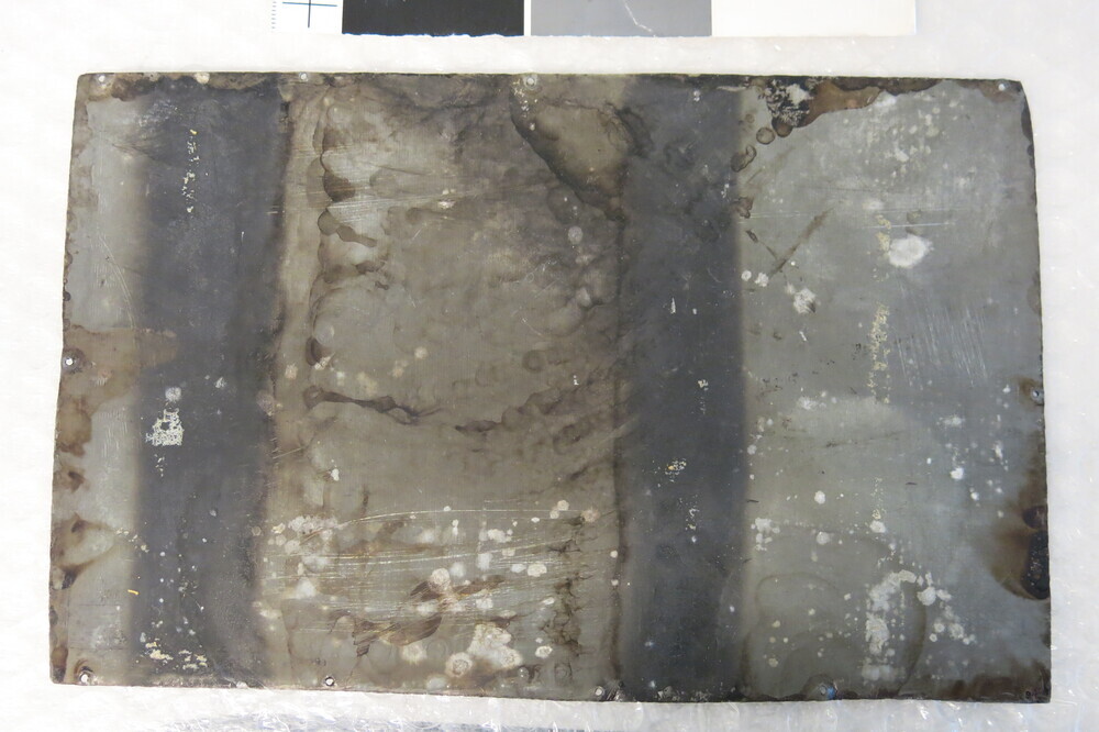 Plaat met inscriptie, vrijwel onleesbaar: handtekening G.J. de Koning?