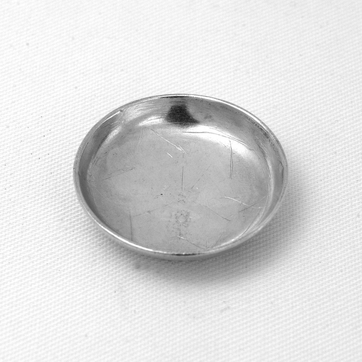 Ronde schotel staande op voetring met gegraveerde ster op de bodem