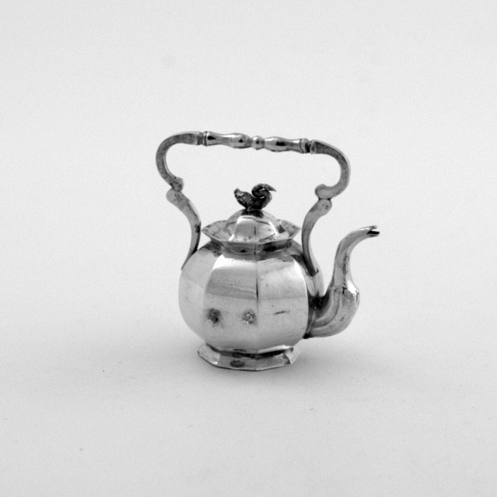 Achthoekige voetring met achthoekig bolvormig lichaam, sterk S-vormig gebogen deels geribte tuit, vast in het midden geprofileerd hengsel, sluitrand naar buiten omgebogen waarin een los achthoekig gewelfd deksel bekroond met een vis.