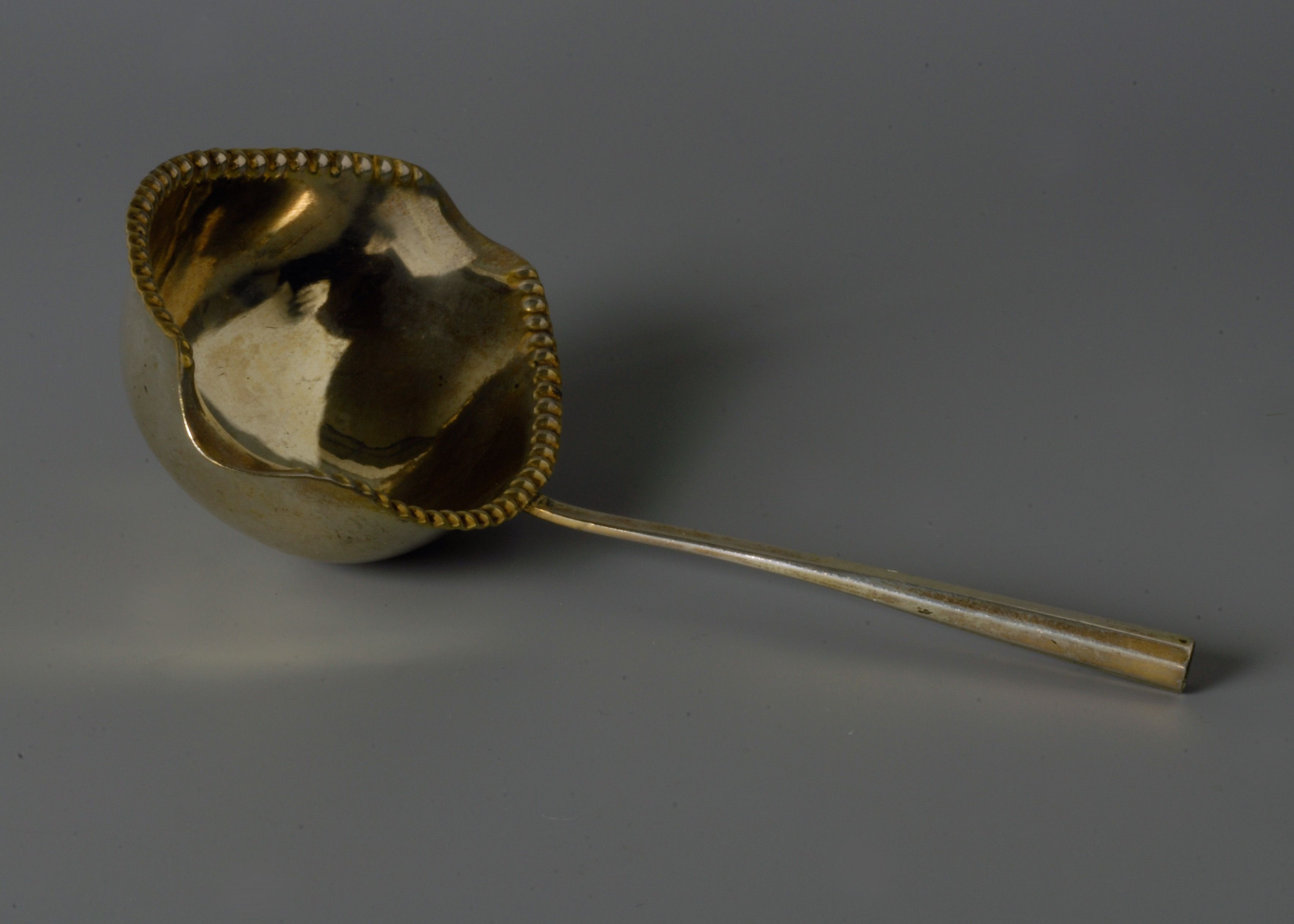 Diepe spits ovale bak met twee schenktuiten en de lange zijde met gedreven parelrand, biennenzijde verguld, slanke steel aanzet op de lange zijde houtensteel ontbreekt- Trefwoorden