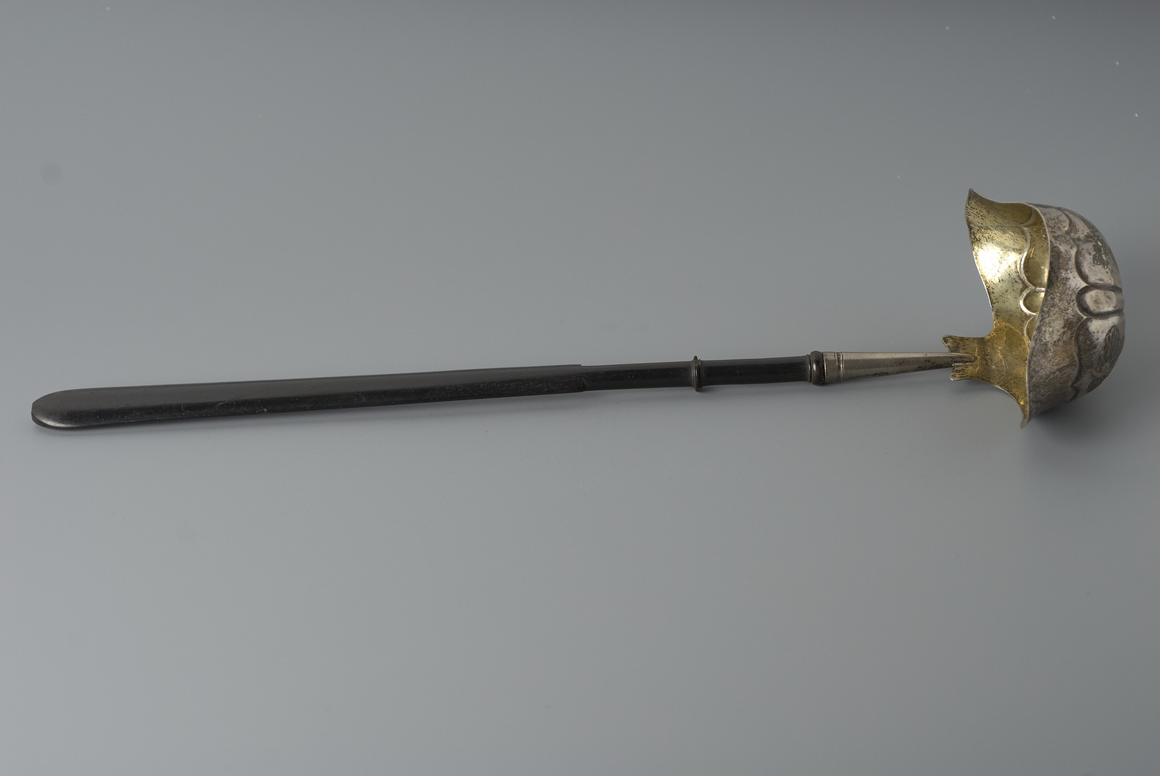 ebbenhoutensteel met aangezette houder waaraan een gedreven ovale bak met twee schankzijde,- Trefwoorden