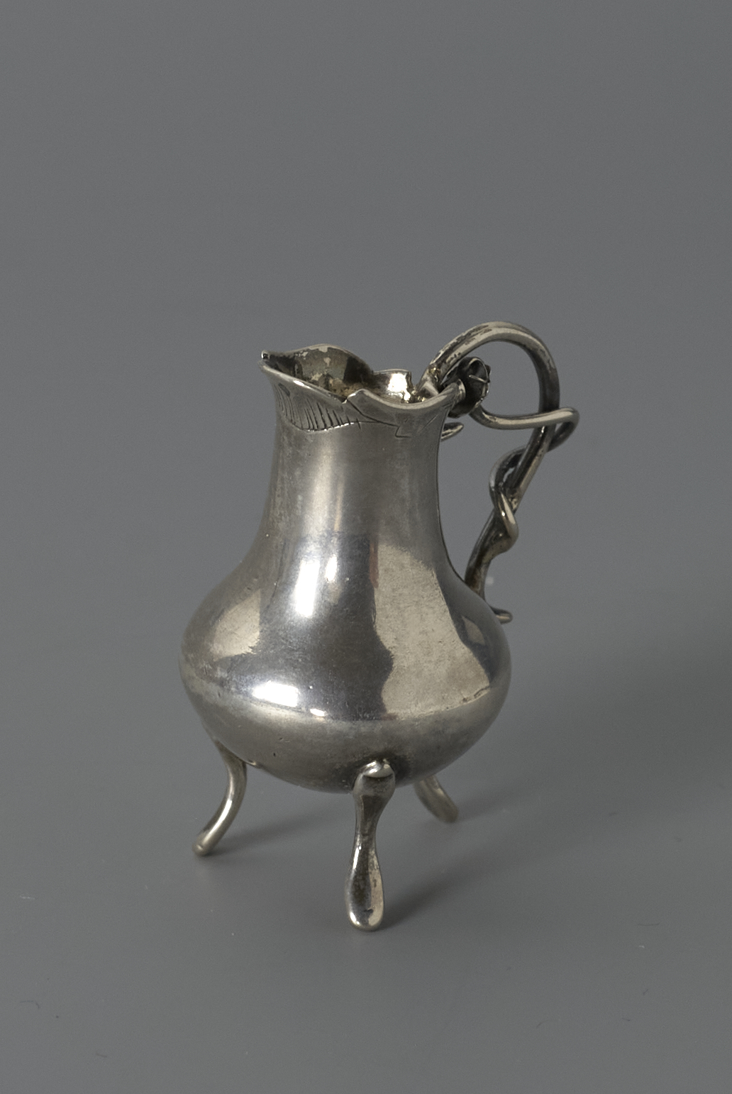 Melkkan op driepoot S-vormig oor met een geslingerde bloem en brede schenktuit.- Trefwoorden