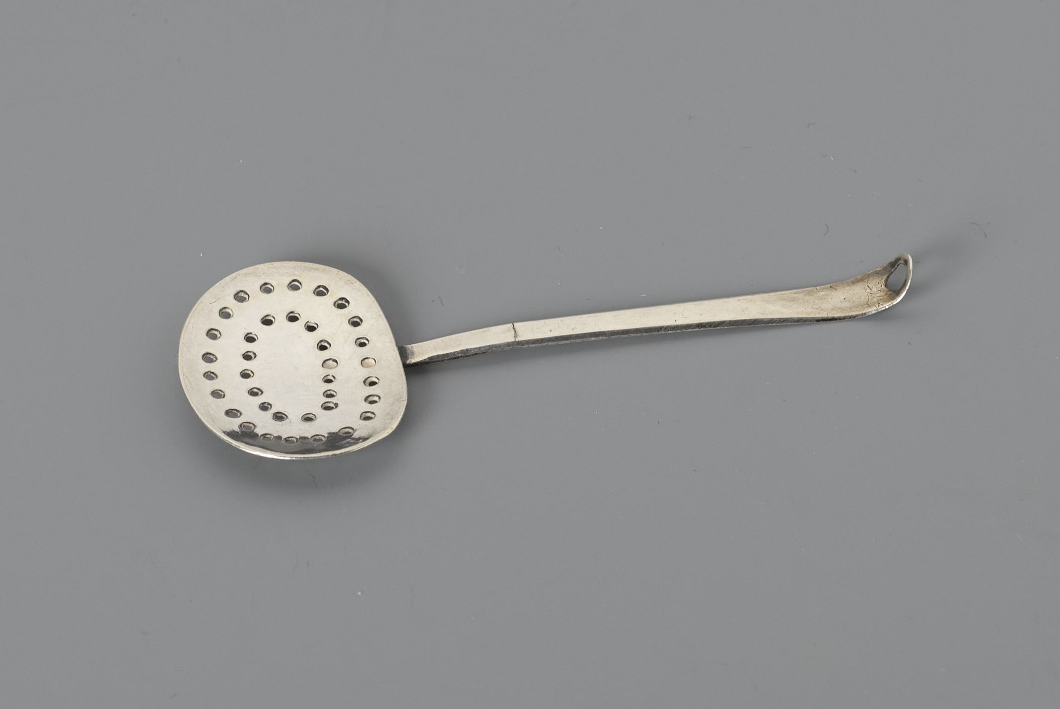 Lichtgewelfde ovale bak met gaatjes in twee cirkels, lange steel met puntige aanzet en in het uiteinde een gat.- Trefwoorden