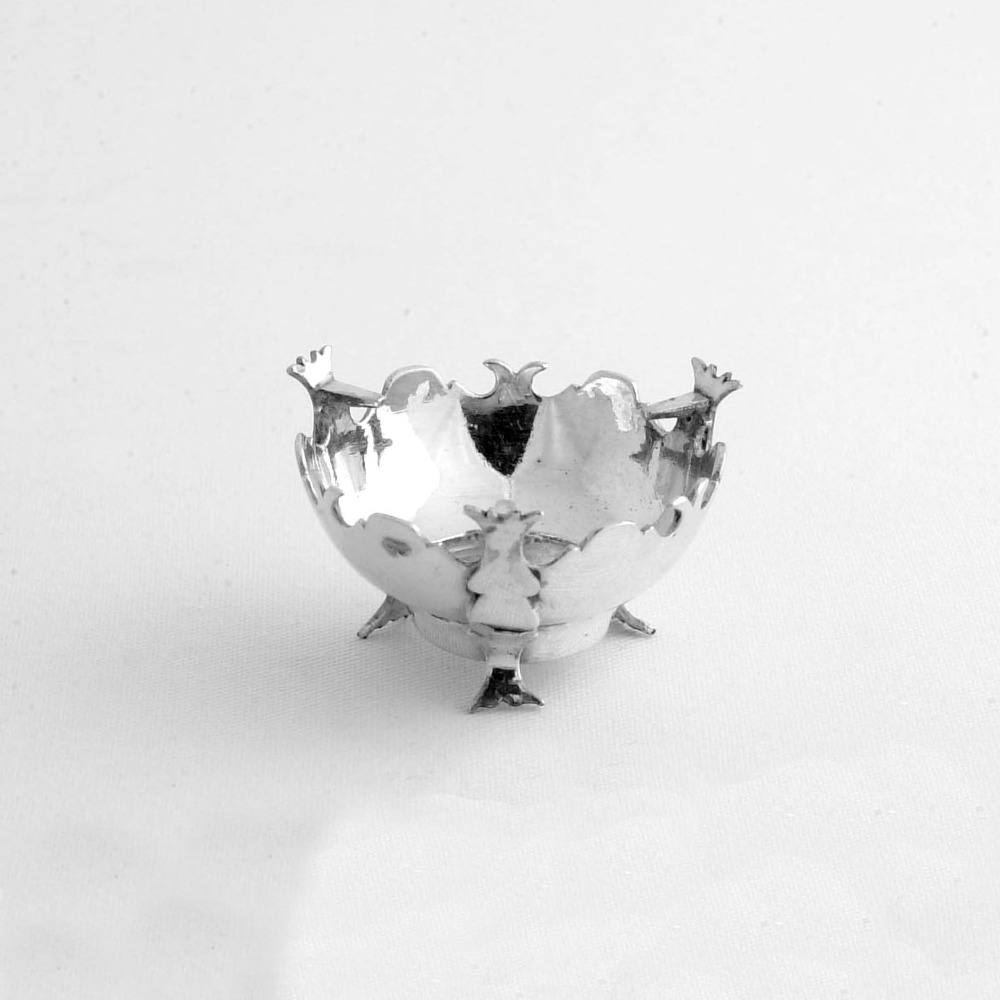 Komvormig lichaam met verdiepte bodem, staande op drie pootjes die doorlopen tot boven op de rand en dienen als steunen.