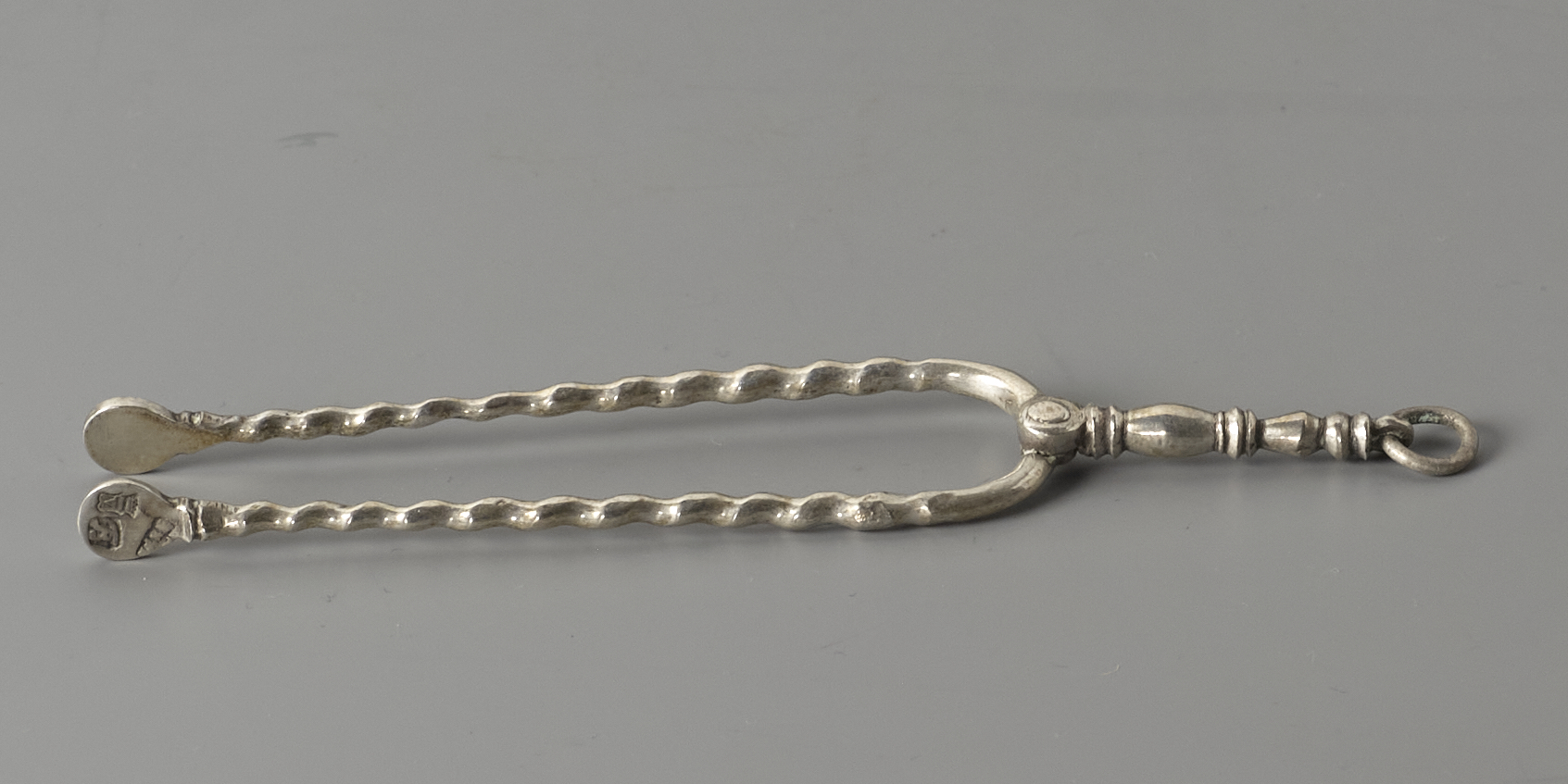 Haardtang met getorste benen, met korte greep en ophangring.