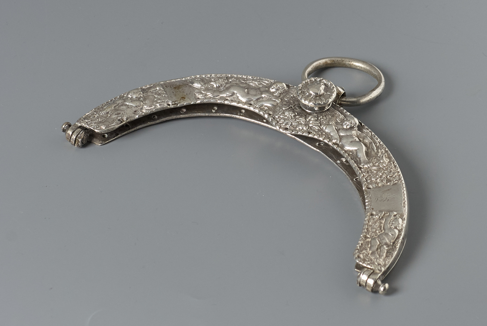 Halfronde tasbeugel met scharnierende buitenbeugel, sluitknop en ophangring.