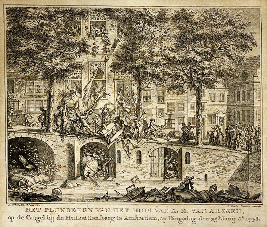 Simon Fokke schetste de plundering van het huis aan het Singel 187 van de wijnhandelaar en belastingpachter A.M. van Arsen en van de daaronder gelegen wijnkelders. Stoelen, klokken, schilderijen, vogelkooitjes, servies en ander huisraad belanden op straat of in de gracht. Vanuit de kelder wordt een groot wijnvat in het water geleegd. Een aantal mensen heeft zich wat te uitbundig aan de wijn gelaafd.