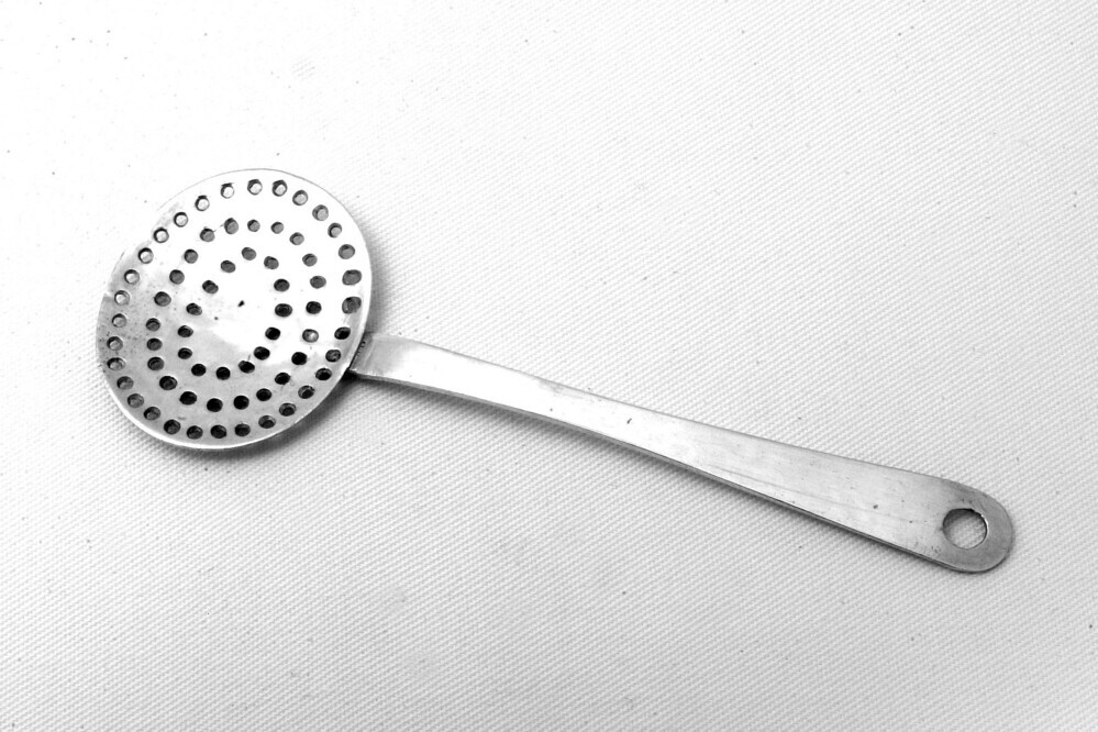 Lichtgewelfde ovale bak met gaatjes in drie rijen, lange steel met puntige aanzet en in uiteinde een gat.