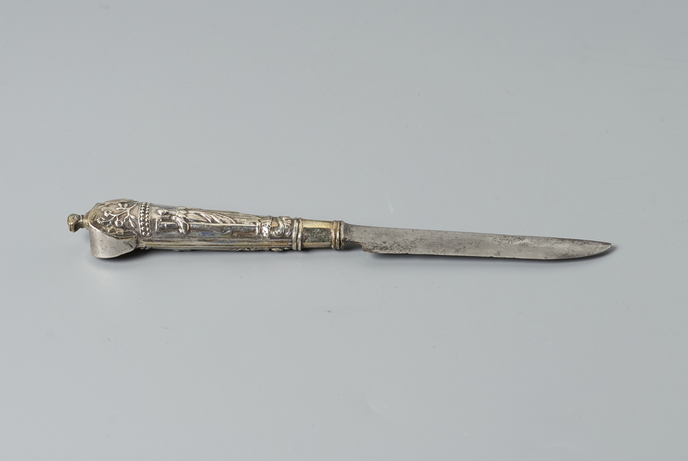 Pistoolmes met een gestampt decor van twee vrouwenfiguren waaronder de Hoorn des Overvloeds.- Trefwoorden