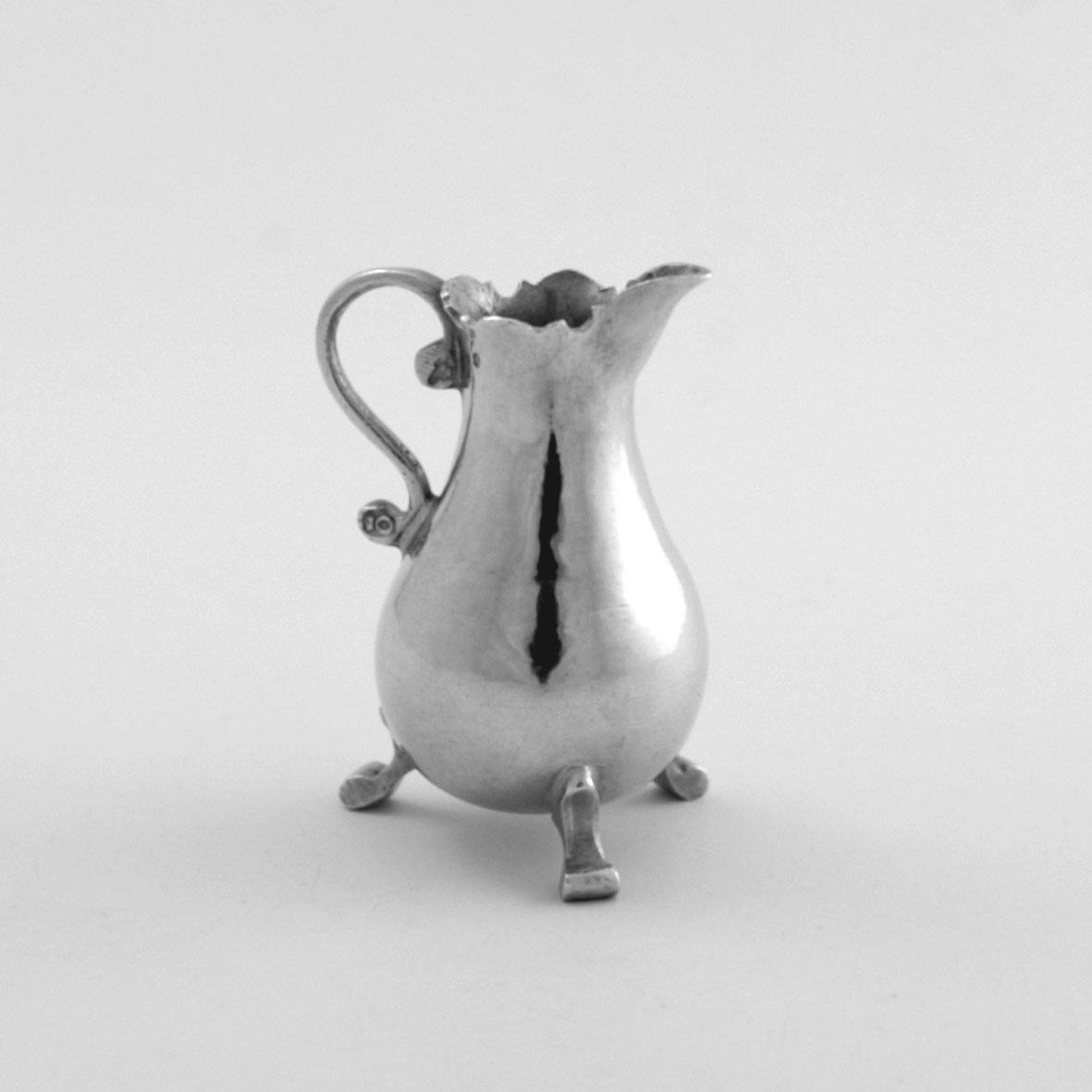 Peervormig glad lichaam op drie pootjes met gecontourneerde bovenrand, schenktuit en glad aangezet S-vormig oor.