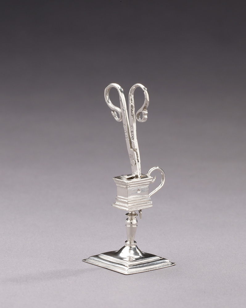 Rechthoekige houder met oor op vierkante voet, waarin een snuiter met twee benen en een rechthoekig bakje.