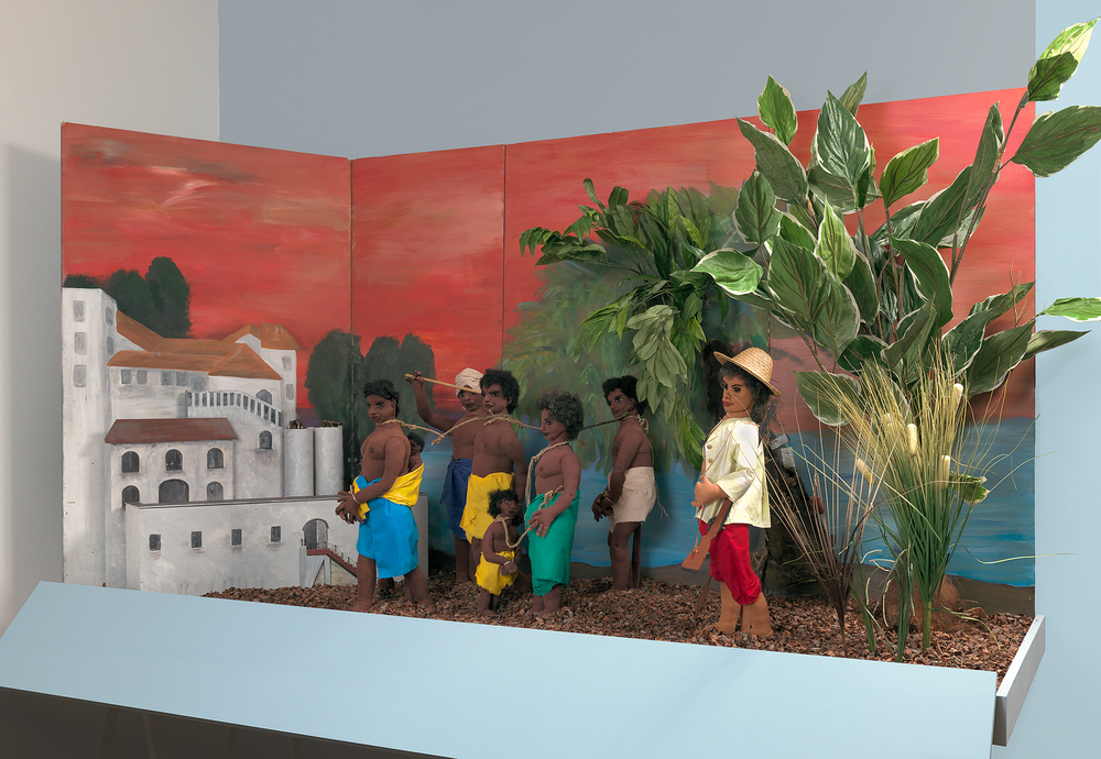 Maasdamme verbeeldt in dit diorama de aankomst van tot slaaf gemaakte mensen bij Fort Elmina in het huidige Ghana. De Afrikaanse gevangenen worden door slavenhandelaars het fort ingedreven om hen vervolgens via de Door of No Return over de Atlantische Oceaan te verschepen. De mensonterende manier waarop de slavenhandelaars mannen, vrouwen en kinderen behandelen is goed zichtbaar: aan hun nek en handen vastgebonden worden ze onder dreiging van een zweep vooruit gedreven. Door de creaturen een naam te geven benadrukt Maasdamme juist de menselijkheid van deze tot slaaf gemaakte mensen.