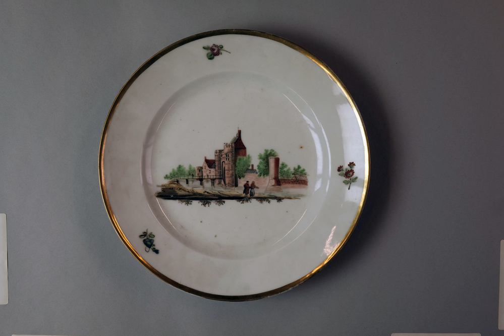 Bord met een afbeelding van een historisch dorpsgezicht of gebouw.- Trefwoorden