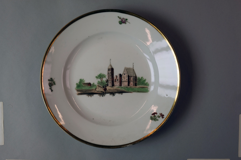 Bord met een afbeelding van een historisch dorpsgezicht of gebouw.- Trefwoorden