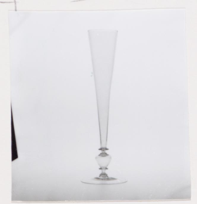 Helder kleurloos, grijs getint glas. Platte voet met omgeslagen rand. Basisschijf. Holle balusterstam met twee schijven. Hoge conische kelk.- Trefwoorden