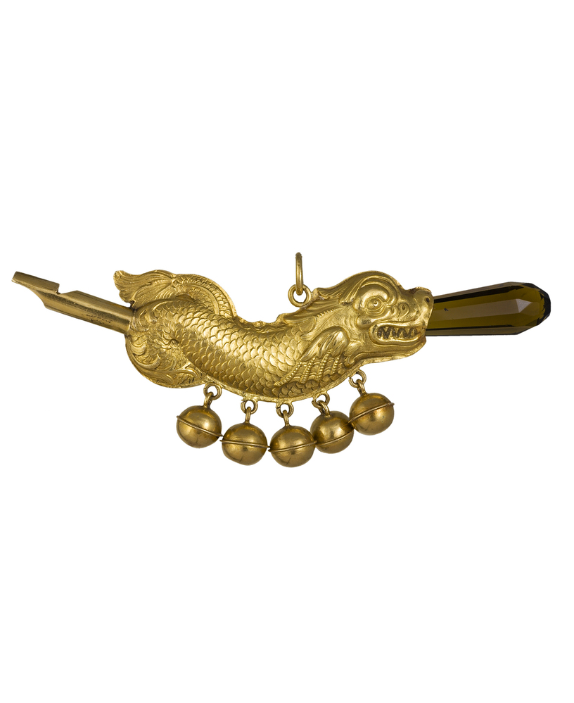 Dit pronkstuk in de vorm van een zeedier trekt de aandacht. Niet alleen vanwege de uitvoering in een combinatie van goud met geel kristal, maar vooral in de manier waarop fluitje en bijtstuk in zijn lichaam zijn verwerkt: de staart van zijn geschubde lichaam kronkelt zich als een klem om het fluitje in zijn achterlijf, wat zich in een lijn door het dier doorzet naar het facet geslepen bijtstuk in zijn getande bek.