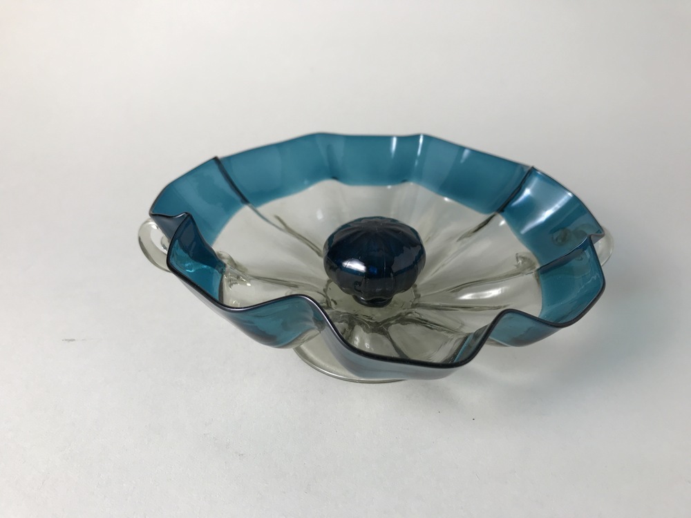 Helder kleurloos, grijs getint glas, helder blauw glas. Concaaf-conische voet. Wijde achtlobbige kelk, de bovenzijde met een brede band van blauw glas. Twee S-vormige oren, de uiteinden spiraalvormig ingerold. Op bodem kelk een knop van blauw glas met in de vorm geblazen ribben.