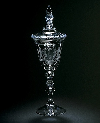 Helder kleurloos glas. Conische voet. Basisknoop met luchtbel. Balusterstam met luchtbel, twee knopen en twee rijen luchtbellen. Conische kelk met afgeronde basis. Op kelk een gekroond rococo cartouche met het stadswapen van Amsterdam, gehouden door twee leeuwen. Op andere zijde het opschrift: 'T = WELZYN VAN DE REGEERING DER STAD AMSTELDAM =/. Gewelfd deksel met samengestelde knop en langgerekte luchtbellen. Rondom deksel en dekselrand gestileerde bloem- en bladranken. Gesigneerd en gedateerd op voet in diamantgravure: Jacob Sang, fec= Amsterdam 1757,/. Gepolijste details.