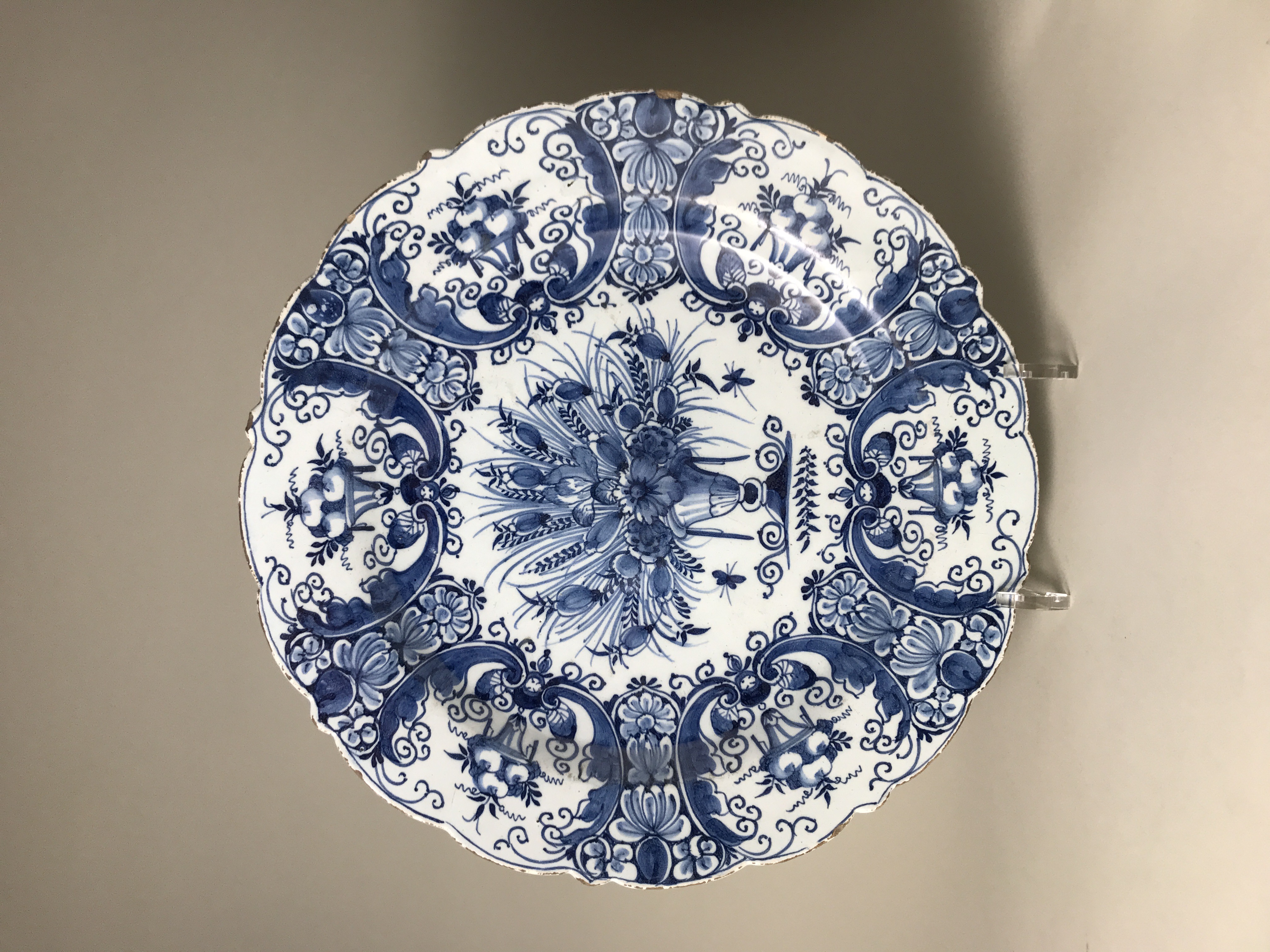 Rond model met geschulpte rand, blauw decor, in het midden vaas met bloemen en insecten, op de rand vruchten in bak, voluten en bloemen.- Trefwoorden