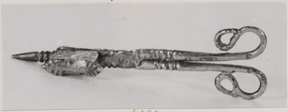 Schaar met S-vormige ogen en geprofileerde benen, geklonken draaipunt en rechthoekige bak met geprofileerde buitenzijde, zich herhalend in de punt; het andere been met de sluitdeksel.- Trefwoorden