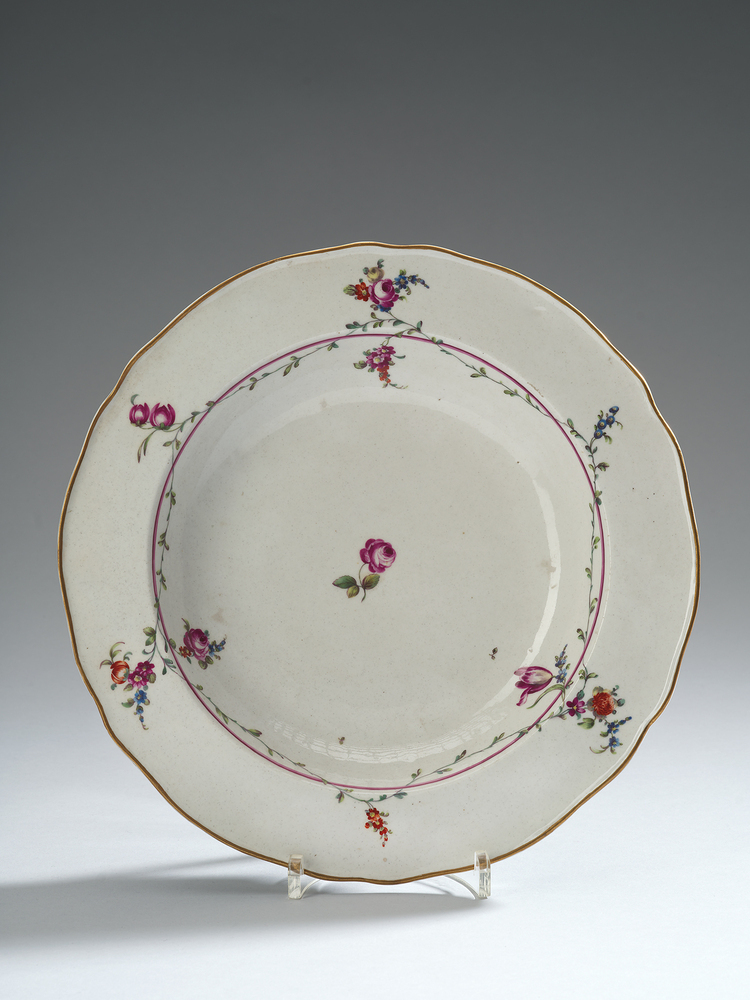 Bord met een geschulpte en vergulde rand. Om de paarse bies een groene bladslinger met veelkleurige boeketten en in het midden een roos. Gemerkt: M:OL. in blauw onderglazuur, ingegrift MB X.- Trefwoorden