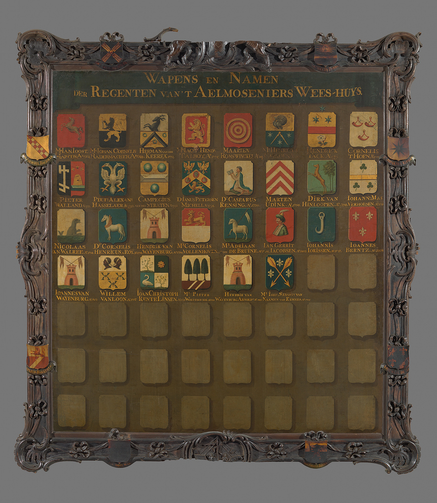 Wapen en namen van de regenten van het Aalmoezeniersweeshuis 1764-1824 in lijst. , 1764 - 1824
