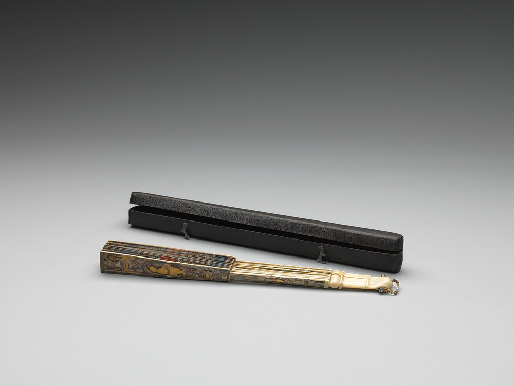 Voowwaaier met tweezijdig beschilderd blad en montuur van bewerkte benen. Met bijbehorende doos.- Trefwoorden