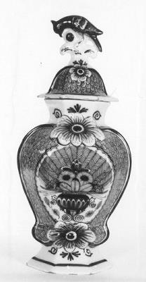 vaas van een 5-delig kaststel. Bloemmotieven en pauwdécor. Gekruifd deksel met vogel- Trefwoorden