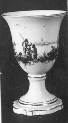 De beker voorzien van een 'encre de Chine' beschildering met een gezelschap aan een rivierover met op de achtergrond een stadje met kerk en gebouwen.- Trefwoorden