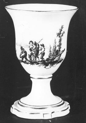 De beker voorzien van een 'encre de Chine' beschildering met een gezelschap aan een rivierover met op de achtergrond een stadje met kerk en gebouwen.- Trefwoorden