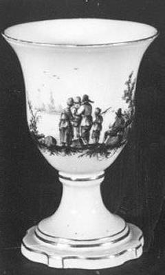 De beker voorzien van een 'encre de Chine' beschildering met een gezelschap aan een rivierover met op de achtergrond een stadje met kerk en gebouwen.- Trefwoorden